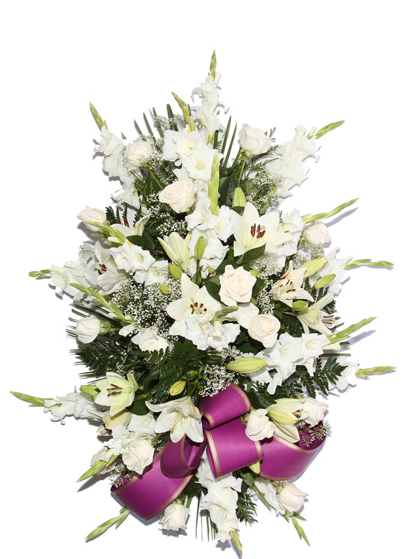 Palma funeraria elegante compuesta de gladiolos, lilium y rosas. Gran tamaño.